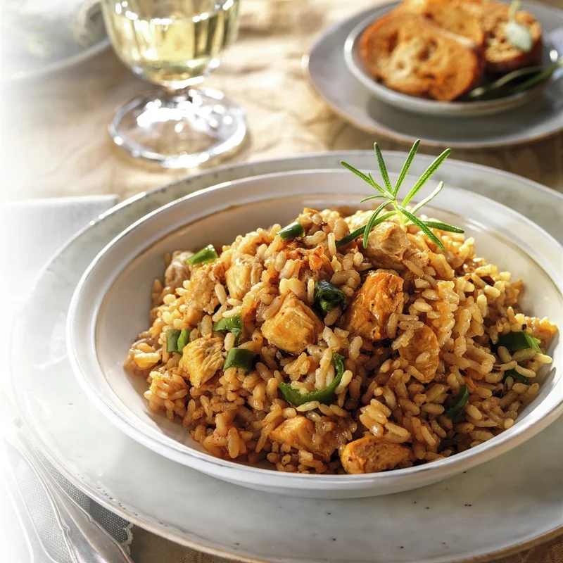 Ароматный рис с курицей Этот простой рис с курицей очень вкусный и станет постоянным блюдом в вашем ежедневном меню. Добавьте тимьян, розмарин и шафран для придания аромата и цвета. , Еда и рецепты