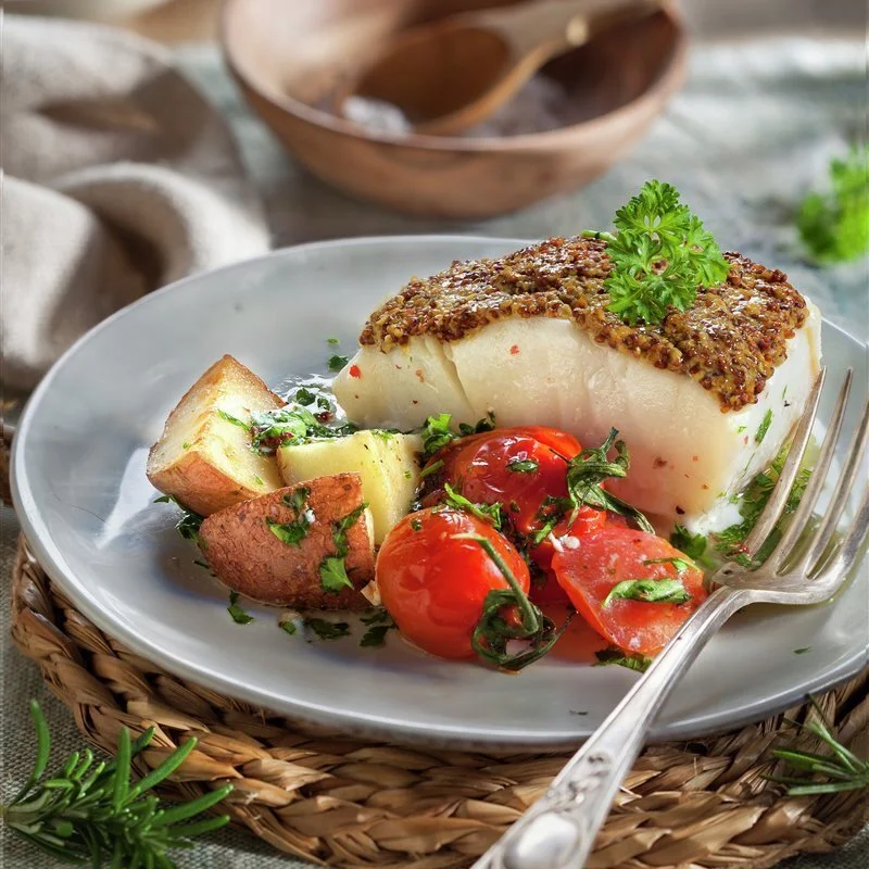 Треска, запеченная с горчицей Сегодняшнее предложение - сочная запеченная треска с горчицей. К нему подается картофель в кляре и помидоры черри. Перед запеканием треску смазывают медово-горчичной смесью. , Еда и рецепты