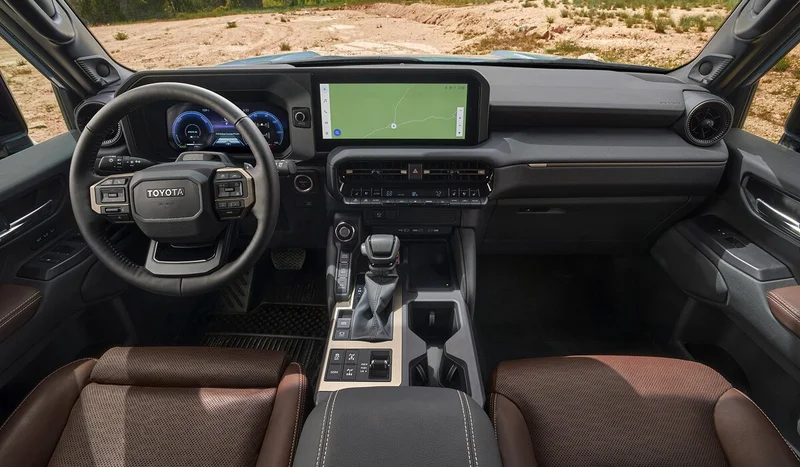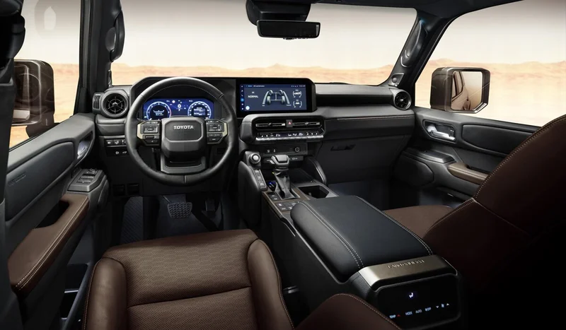 Prado также может похвастаться двумя или тремя рядами сидений, предлагая повышенный уровень комфорта для пятерых или даже семерых пассажиров. Старые аналоговые приборы уступили место современному виртуальному миру, позволяя водителю углубиться в информацию с помощью экранов размером от 8,0 до 12,3 дюймов. Однако появившаяся передняя панель словно сохранила аналоговый вкус, в лучших традициях: лесенки, украшенные клавишами и переключателями, а также оливковым ветвями в виде традиционного селектора коробки передач.