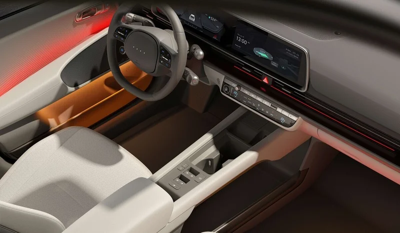 Ioniq 6 оборудован двумя 12-дюймовыми экранами приборной панели и медиасистемой, кроме этого контурная подсветка из 64 цветов, 6 двухцветных комбинаций и режимом Speed Sync Lighting, меняющим яркость от скорости движения.