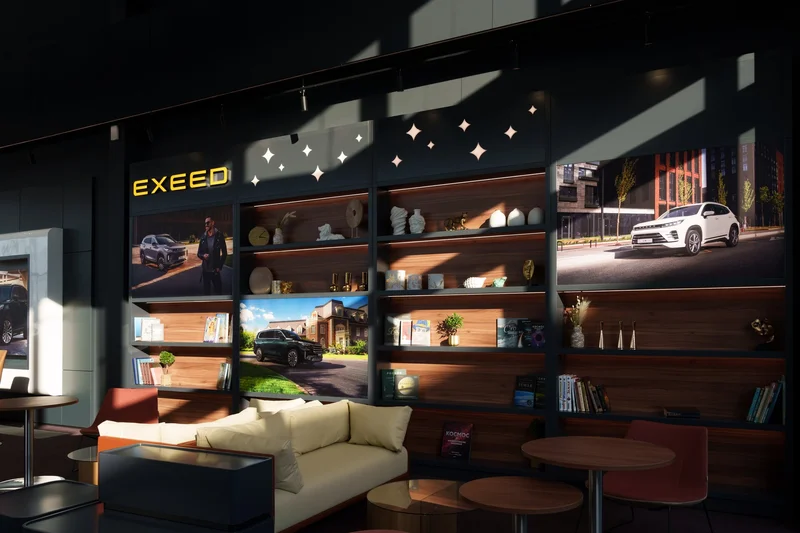 В шоуруме, площадь которого составляет более 450 кв.м., представлены актуальные модели бренда. Выдача автомобилей осуществляется в закрытой приватной зоне, оказываются консультации по всем направлениям деятельности. Визуальный центр притяжения в шоуруме - кафе и клиентская зона, интерьерные решения которых были определены на основе понимания потребностей клиентов EXEED.
