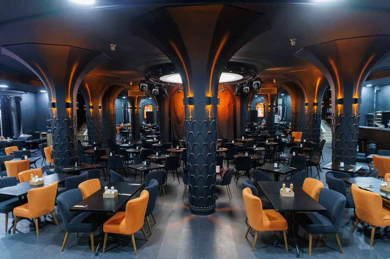 А сейчас буквально только, мы открыли "Сергеич Камеди-бар", причем его концепция сложилась с первого посещения площадки - сталинской высотки. Мною сразу было предложено сделать проект в стиле готики - все темное, оставить акцентные колоны с лепниной с проработкой света, а также сохранили люстру — все это придало особый шарм помещению.