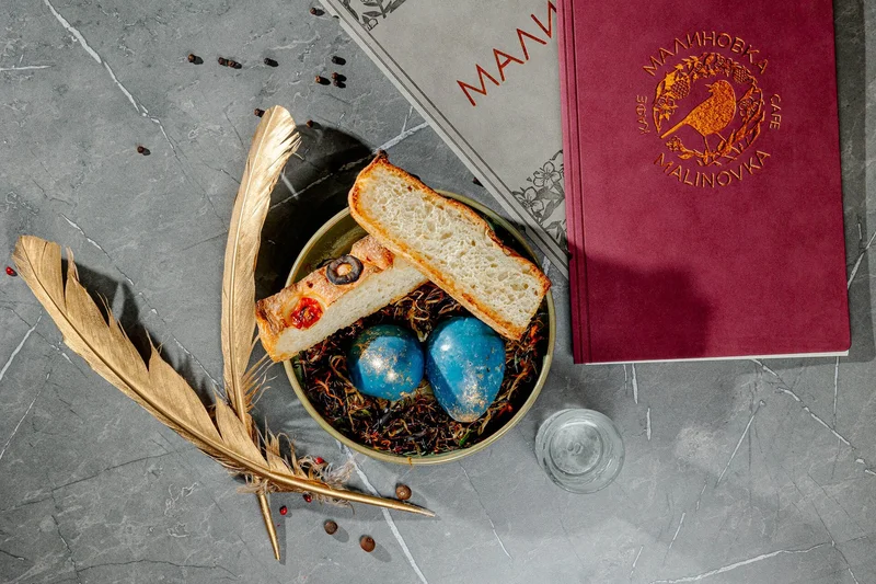 Красная линия проекта проходит через все, что связано с малиной и птичками, поэтому самые интересные позиции следует искать тут, а это могут быть: паштет из птицы, который подается в форме гнезда с яйцами, где гнездо - пай; консоме из грибов и утки; утиная грудка гриль с конфитюром из ягод и фруктов.
