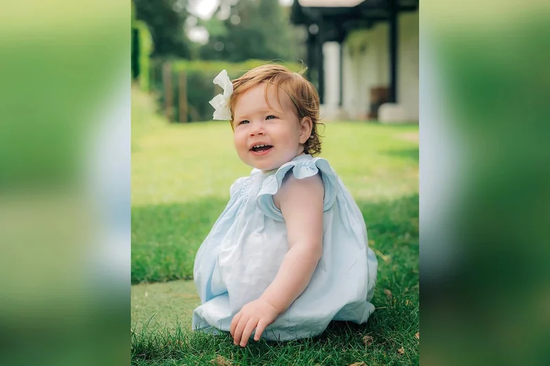 Как можно увидеть на снимке, девочка унаследовала рыжие волосы отца и его голубые глаза. Она сфотографирована сидящей на траве в нежно-голубом платье и с белым бантом, с улыбкой смотрящей чуть в сторону.