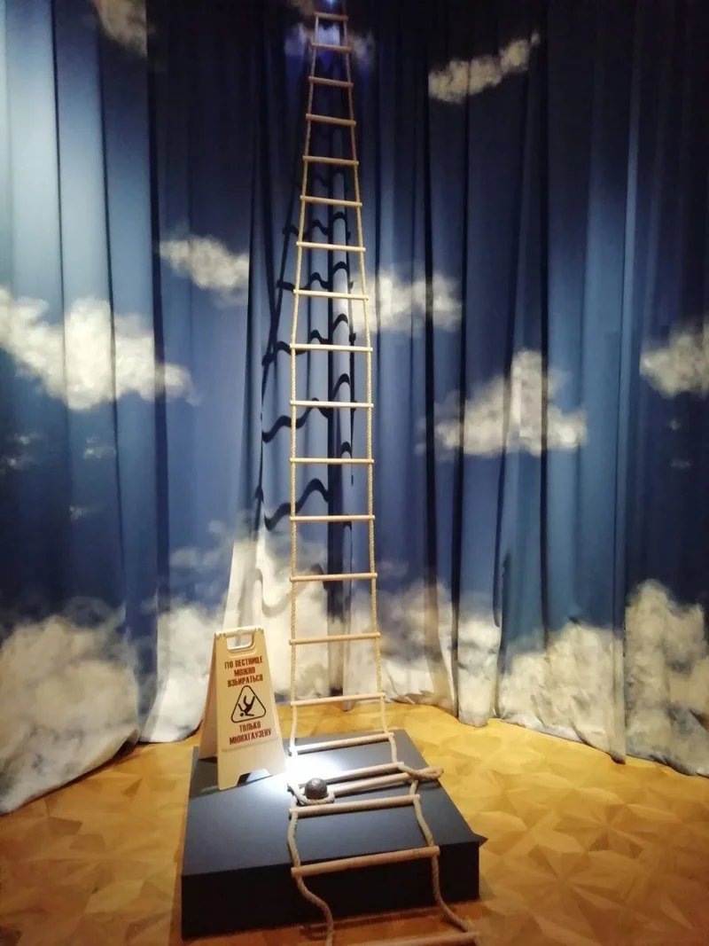 А при входе в кинематографическую часть вселенной их встречает одна из самых узнаваемых деталей фильма "Тот самый Мюнхгаузен". Решение воссоздать в музейном пространстве лестницу в небо не только необычное, но и очень трогательное. Однако желающие ощутить себя на месте блистательного Олега Янковского, карабкающегося в голубую высь в финале картины, слегка разочаруются — надпись на табличке предупреждает, что покорять небеса позволено лишь главному герою...