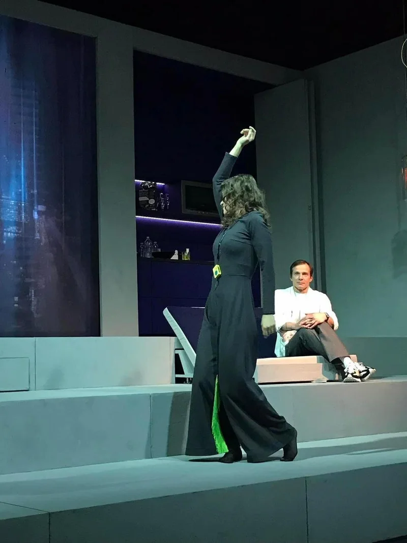 Первое, что видим из зрительного зала — шикарную квартиру с видом на центральную улицу города. Хозяин этой квартиры — писатель Теодор (Андрей Кузичев) ощущает себя в ней довольно свободно — раздаёт команды голосовому помощнику, самозабвенно работает, а в свободное время поддерживает физическую форму на беговой дорожке. В его доме всё автоматизировано — двери, ящики стола, шкаф — всё движется, самостоятельно открывается и выдвигается, избавляя владельца от необходимости прикладывать усилия к обеспечению комфорта для себя.