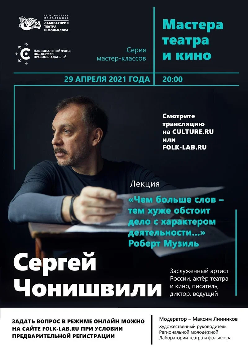 29 апреля состоится виртуальный мастер-класс Сергея Чонишвили Актёр расскажет о тонкостях работы на съёмочной площадке и в театре. , Культура