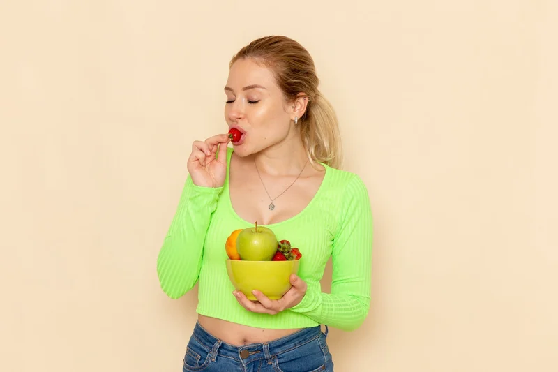 Девушка ест фрукты Источник фото: @kamranaydinov/freepik.com