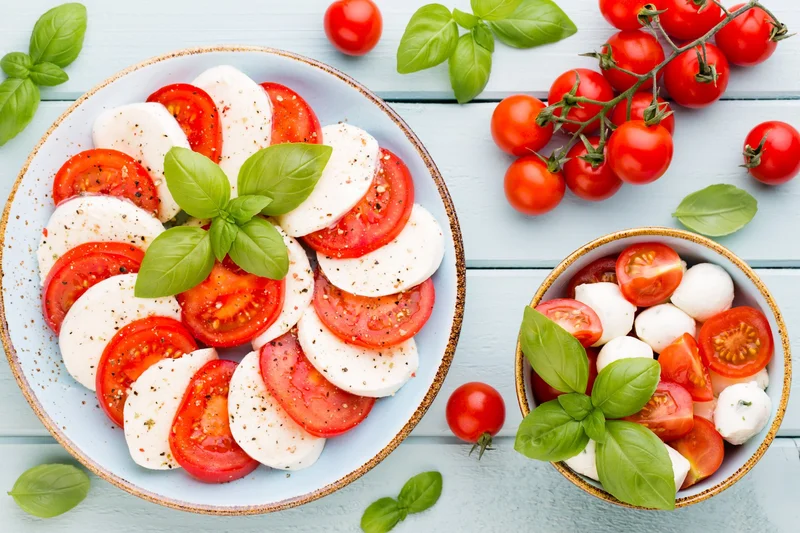 Помидоры и листья базилика тщательно вымыть и обсушить. Разрежьте помидор на 8 равных частей и отложите в сторону. Моцареллу разрезать пополам и каждую половину разрезать на 3 части. На блюдо выложите кусочки помидоров вперемежку с кусочками моцареллы. Заправьте оливковым маслом, солью и черным перцем и в завершение добавьте листья базилика. Подавать с поджаренным хлебом или в качестве гарнира к рыбе или курице.