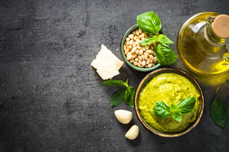 Тщательно вымойте и обсушите листья базилика и отложите в сторону. Очистите зубчики чеснока от кожуры и поместите их в кухонный комбайн. Добавьте оливковое масло, грецкие орехи и сыр пармезан и хорошо размельчите. Положите листья базилика и размельчите всё до получения однородной пасты. Приправить солью и использовать к пасте, курице или в качестве заправки для салатов.