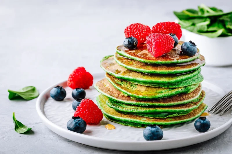 Панкейки со шпинатом, бананами, кокосовой стружкой и миндальной мукой Источник фото: https://ru.123rf.com/photo_116693484_healthy-green-spinach-pancakes-with-raspberries-blueberries-and-honey-for-breakfast.html