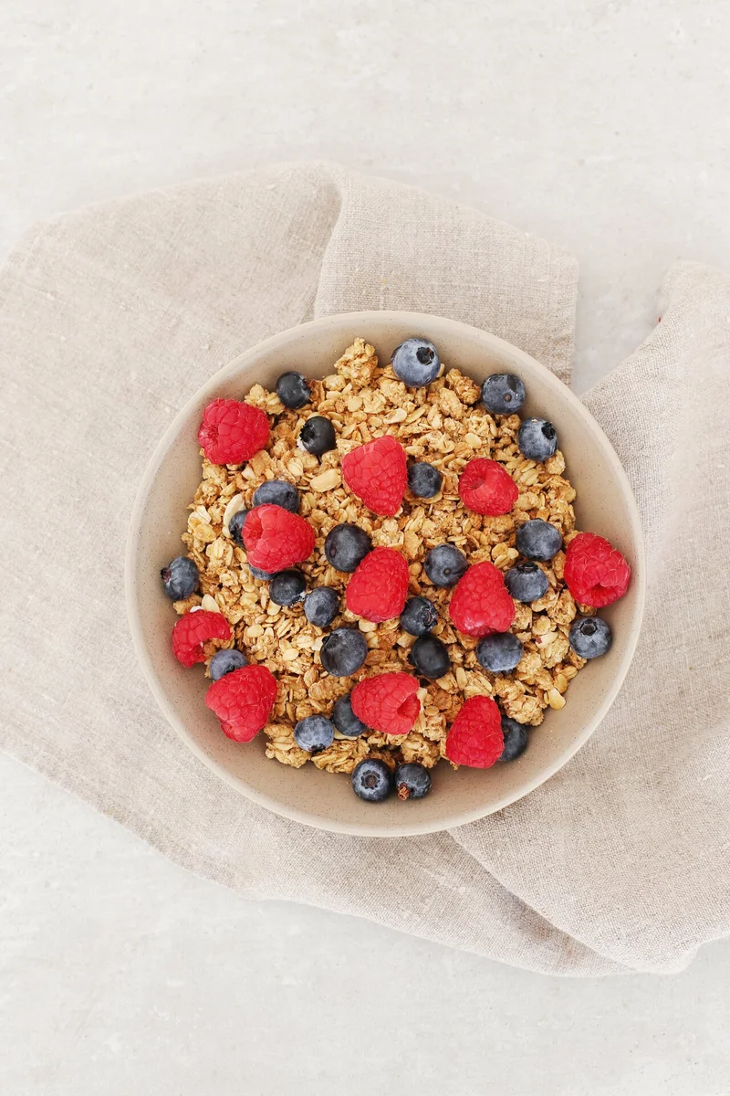 Это прекрасный вариант питательного завтрака. Овсяные хлопья и орехи в составе гранолы положительно влияют на деятельность кишечника и приводят в норму уровень сахара. А ещё гранола обладает лёгкой приятной сладостью.