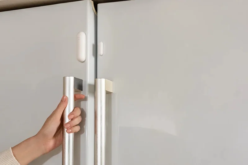 Вторая новинка - датчик дверей и окон, и это не умный замок, а полноценное устройство, которое отправит смс на смартфон, привязанный к приложению Aqara Home, об открытии чего-то. Примечательно, что конструкция умного устройства(из двух половинок) идеально может устанавливаться на холодильник, что позволит создать некий психологический барьер от ночного жора.