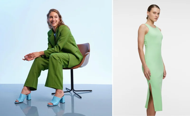 Зелёный считается сложным для подбора одежды, поэтому дизайнеры советуют полагаться на собственное ощущение прекрасного – идёт лично вам или нет. Бренды Johanna Ortiz и Lela Rose остановили выбор на ярком жёлто-зелёном оттенке под названием «kelly green», Rejina Pyo тяготеет к деликатному мятному, а Victoria Beckham добавила в цвет небольшую дозу кислотности. Российский MEYEL предлагает носить зелёный костюм травянистого оттенка и чувствовать постоянное обновление.