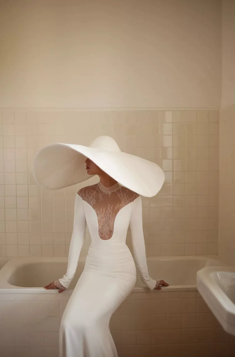 Объёмные головные уборы стали ещё одной стилистической альтернативой Недели свадебной моды 2024. Примеры можно найти у Monique Lhuillier – широкополую белую шляпу – и у Dana Harel – плоскую шляпу кремового цвета. Надеть такой аксессуар отважится не каждая, но он будет вполне уместен для «выездной» свадьбы в тёплом климате или подойдёт тем, кто ищет большой и эффектный завершающий элемент.