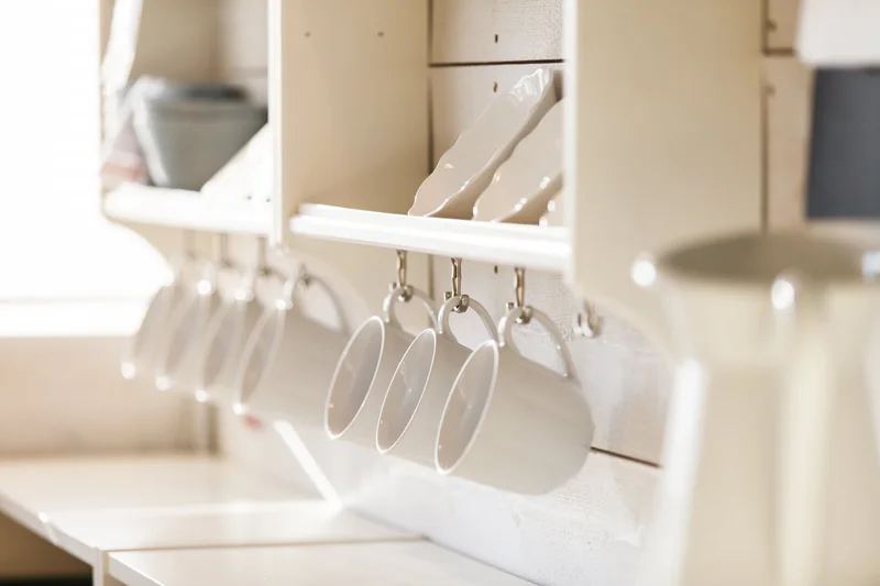 Чистота столешниц - ключ к организованной кухне. Храните бытовую технику и посуду, которыми вы не часто пользуетесь, в шкафах или ящиках, освобождая место для комфортной работы. Чтобы предметы первой необходимости были под рукой, установите планки или крючки на стене или под высокими предметами мебели, где вы можете повесить посуду, которой пользуетесь чаще всего. Помимо практичности, этот метод также добавит эстетичности и уникальности вашей кухне. При этом когда вы решите выставить предметы на обозрение, убедитесь, что они красивые.
