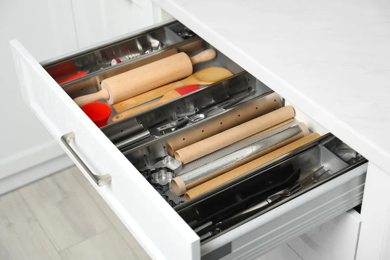 Эффективная стратегия организации кухонных ящиков - разделить их на секции. Используйте разделители или лотки-органайзеры, чтобы классифицировать посуду в соответствии с ее назначением. Таким образом, вы сможете легко найти то, что вам нужно, без необходимости все перемешивать. Кроме того, разделители предотвращают перемешивание и беспорядок посуды с течением времени.
