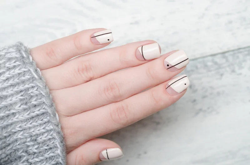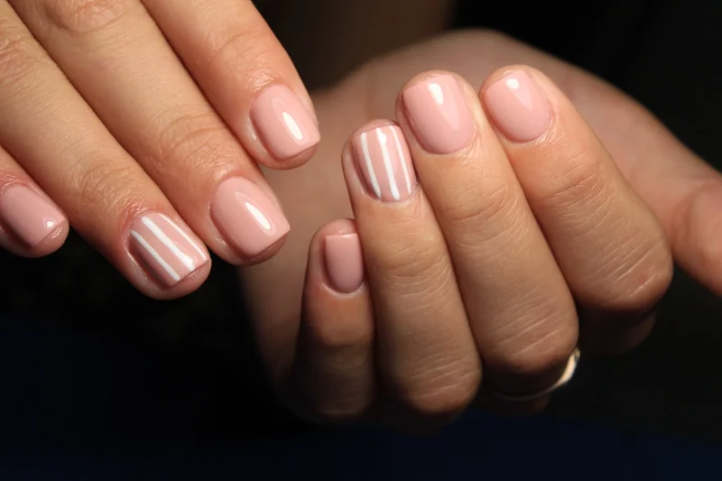 Минимализм и изящество — слова, наиболее точно характеризующие этот маникюр. Яркие тонкие полоски на покрытии нейтрального цвета смотрятся очень эффектно — девочка с таким маникюром поймает множество восхищённых взглядов одноклассников.