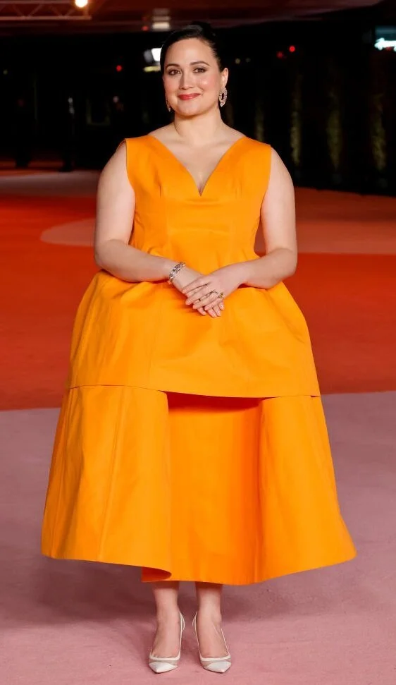 Партнёрша Ди Каприо по триллеру Мартина Скорсезе выбрала для появления на вечере необычное платье от Marnie ярко-оранжевого цвета с юбкой-колоколом, глубоким декольте и широкими бретелями. Образ Лили довершила кремовыми туфлями-лодочками, собранными в высокий пучок волосами и милой улыбкой, завоевавшей сердца всех без исключения фотографов.
