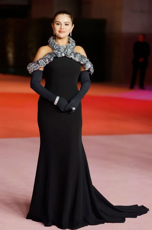 31-летняя певица/актриса предстала в чёрном вечернем платье с длинными чёрными перчатками и эффектным воротником-ожерельем-пелериной из серебряных роз. Строгий образ Селена подчеркнула лаконичным пучком и бриллиантовыми украшениями.
