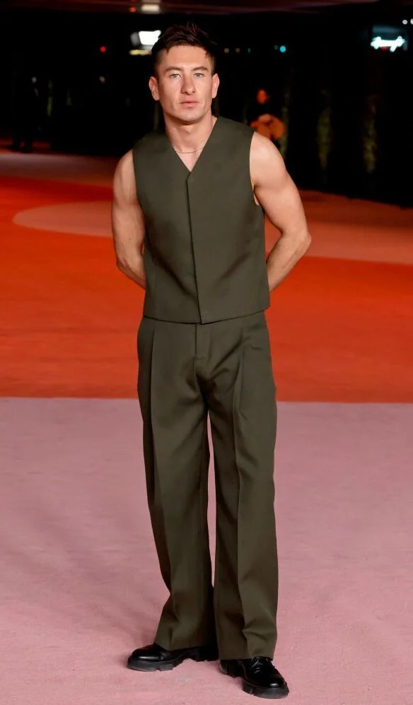 Главная звезда нового фильма Эмиральд Феннел «Солтберн» предстал на красной дорожке в костюме коричневого цвета, состоящего из брюк и жилета. Лаконично брутальный образ актёр подчеркнул ботинками на толстой подошве, впечатляющими бицепсами и слегка взъерошенной причёской.
