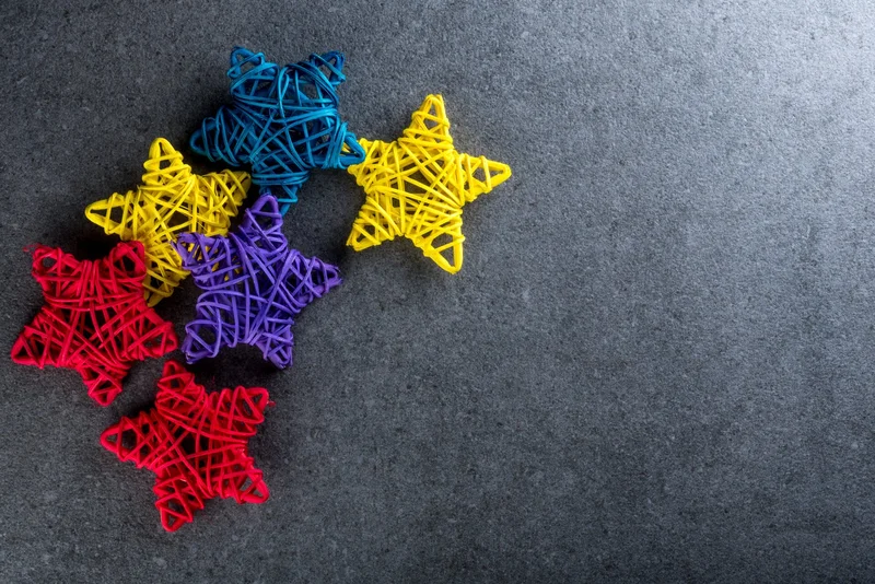 Для этого украшения вам понадобятся кулинарные шпажки. Три шпажки нужно скрепить между собой так, чтобы получился треугольник. Приклеить их друг к другу можно с помощью горячего клея. Повторите эту процедуру ещё два раза — для изготовления одной звёздочки необходимо три "треугольника" из шпажек. Затем соедините между собой треугольники, слегка наложив один на другой так, чтобы получилась звезда. Возьмите белую (или любую другую) пряжу средней толщины и обмотайте получившиеся звёздочки. Их можно расставить на подоконнике или просто повесить под потолком.