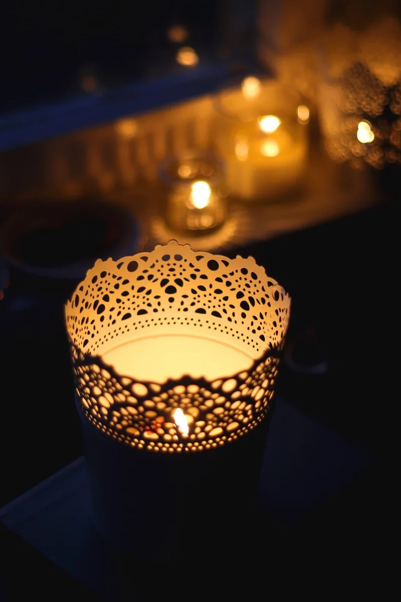 Поставьте свечу в прозрачный сосуд — стакан или колбу. Важно учесть, что свеча должна быть ниже сосуда. Оберните его тканью, прошив ткань ниткой, чтобы не сползала и не разворачивалась. Оберните получившуюся заготовку кружевом или блестящей гирляндой — оригинальный подсвечник готов.