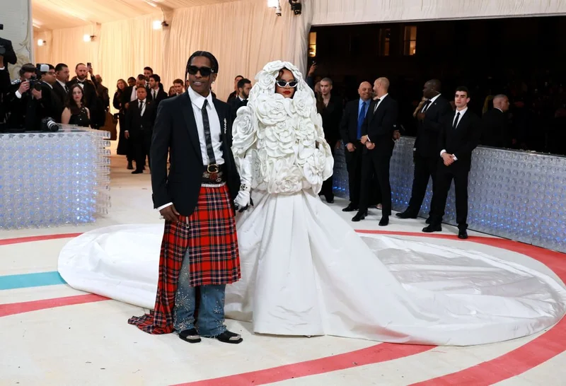 Для традиционного в начале мая бала Met Gala итальянский модный дом Valentino создал беременной вторым ребёнком певице драматичное белое платье. Украшенный розами верх и пышная юбка, эффектно раскинувшаяся на ступенях нью-йоркского музея Metropolitan, сделали её звездой пафосной вечеринки. Наряд спутника, бойфренда-музыканта создали в Gucci – чёрный пиджак, узкий галстук, красный клетчатый килт и потёртые голубые джинсы.