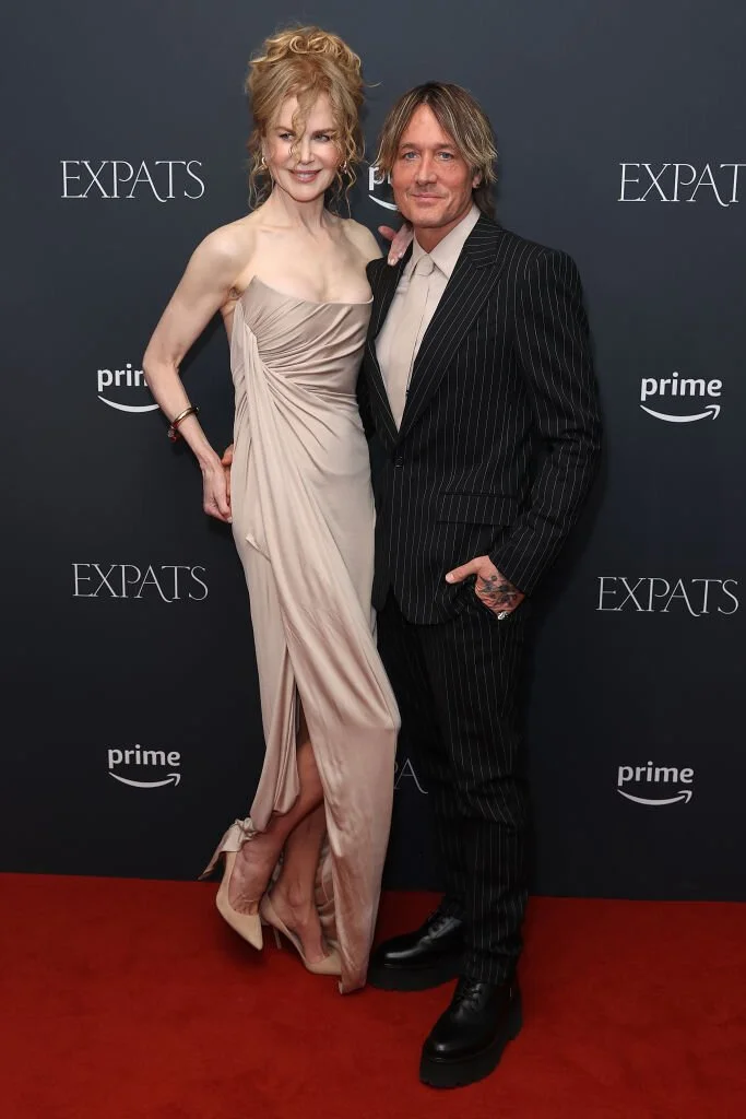 Актриса эффектно появилась на премьере сериала «Экспаты» в Сиднее в светло-бежевом, без бретелей, платье Fendi, подчеркнувшем цвет её кожи. Урбан совпал с женой через галстук и рубашку. Элегантный чёрный костюм в тонкую белую полоску он дополнил ботинками на платформе.