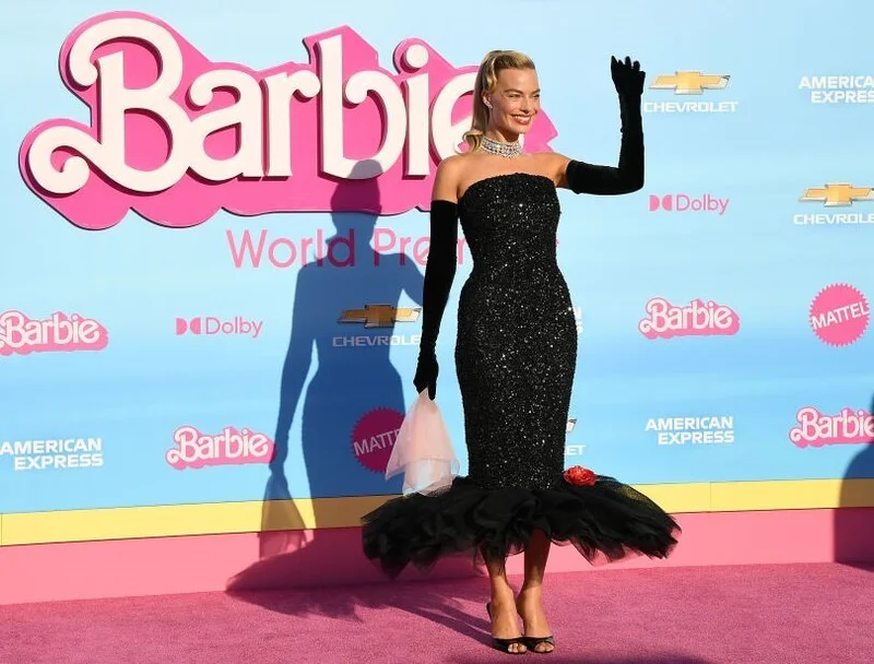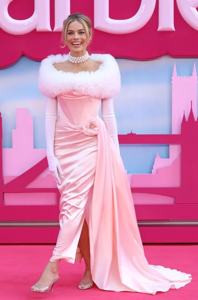 Лучшим нарядом в негласном хит-параде образов Робби из «Барби» считается её вечернее платье из нежно-розового атласа со шлейфом и меховой оторочкой от Vivienne Westwood. Образ был вдохновлён одной из версий куклы 60-х годов и дополнен длинными белыми перчатками, жемчужным ожерельем и серёжками, а также элегантной причёской. По иронии судьбы, этот «яркий» образ стал для Марго последним из-за возобновления забастовки голливудских сценаристов и актёров. Премьеры фильма в Нью-Йорке и Берлине состоялись уже без участия съёмочной группы.
