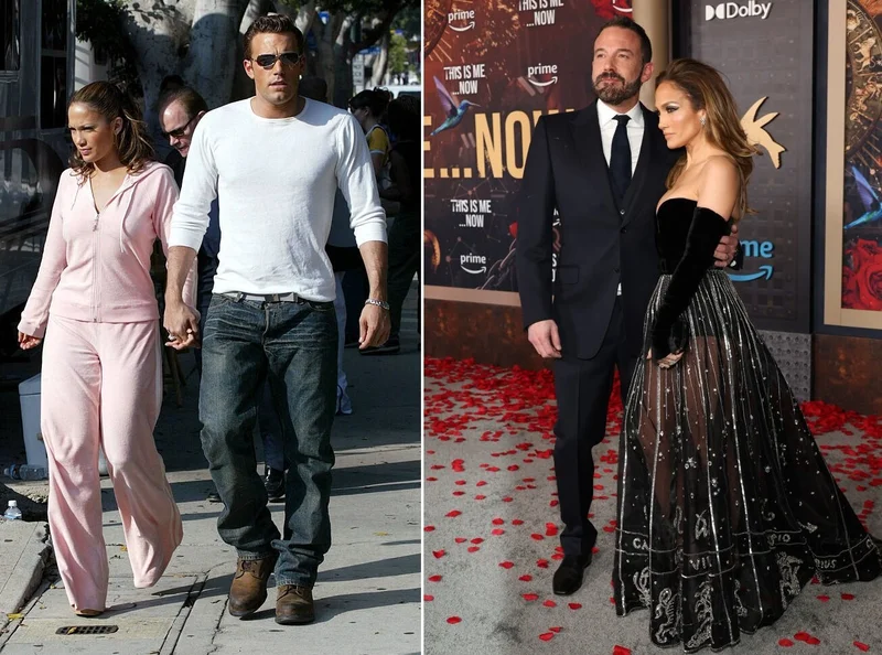 Дженнифер Лопес и Бен Аффлек в 2002 и 2024 гг. Источник фото: Mel Bouzad, Monica Schipper/Getty Images