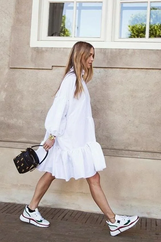 Простое лёгкое платье можно надевать в течение всего лета. Для похода в будни в ресторан или прогулки в выходной к пруду, зависит от того, как вы его дополните. Стилисты предлагают поиграть на контрасте и, например, сочетать платье с массивными «папиными» кроссовками, что будет смотреться свежо и весело.