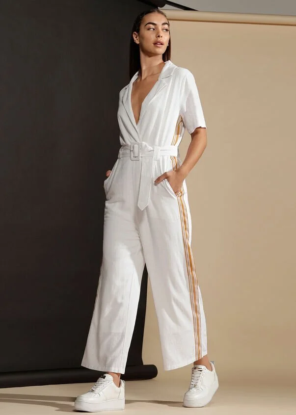 Если нужен скорейший способ одеться утром (когда ещё непонятно, что это может быть), доставайте комбинезон. Из белого денима – прикольный и освежающий, универсальный и расслабленный. Обувь на каблуках и большие украшения завершат образ.