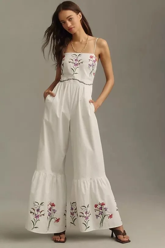 Почувствовать себя детьми цветов можно сразу всей семьёй. Если вы едете, например, на музыкальный фестиваль или в путешествие по Золотому кольцу, вам пригодятся модели с вышитыми цветами по лифу или на штанинах-колокольчиках. Если абстрагироваться от 90-х, то впервые комбинезоны именно в таком «флористическом» стиле появились в 70-е, когда молодёжь предпочитала песни под гитару у костра или вечерние дискотеки в пионерских лагерях. К нынешнему десятилетию комбез адаптировался за счёт деликатных деталей и светлых оттенков.