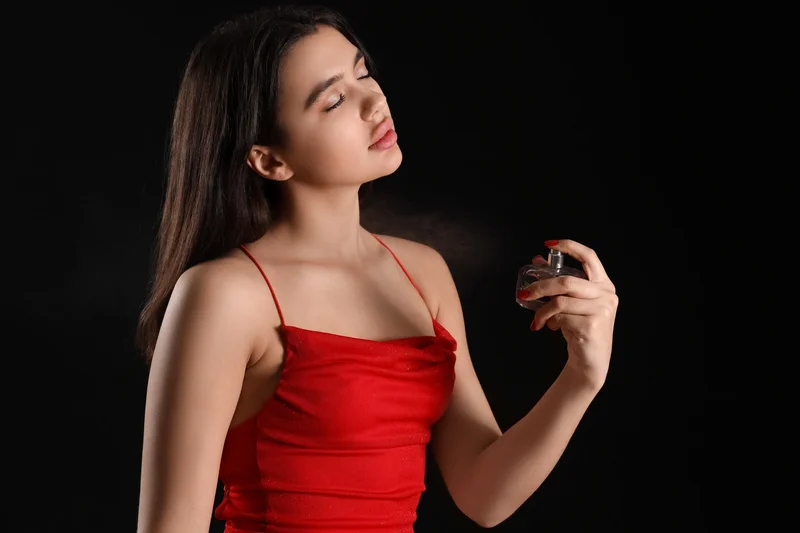Девушка наносит парфюм.