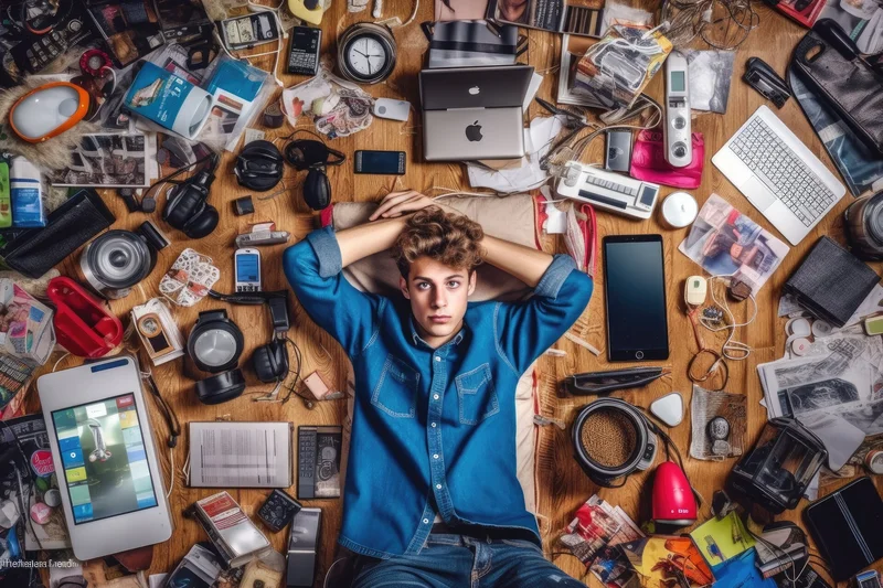 Молодой человек в окружении гаджетов.