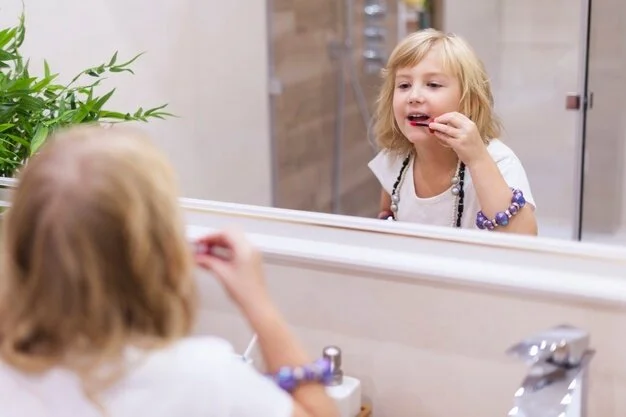 Маленькая девочка красит губы в ванной Источник фото: @gpointstudio