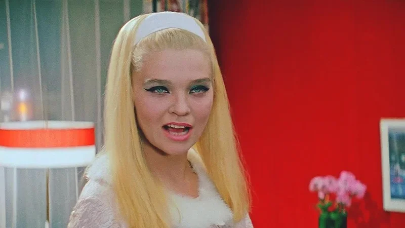 Кажется, эта героиня, нанося мейк-ап, руководствовалась принципом "Всё лучшее сразу!". Её глаза подчёркивают голубые тени и довольно-таки массивные чёрные стрелки. А яркая помада на губах, розовый румянец и гладкие прямые волосы (последний писк тогдашней моды!) завершают этот дерзкий образ. Несмотря на то, что этот макияж, мягко говоря, не для любого случая жизни (да и скромным его не назовёшь...), повторить его пытались многие советские модницы.