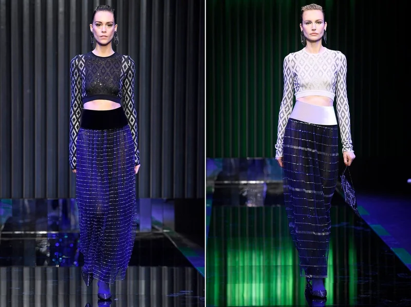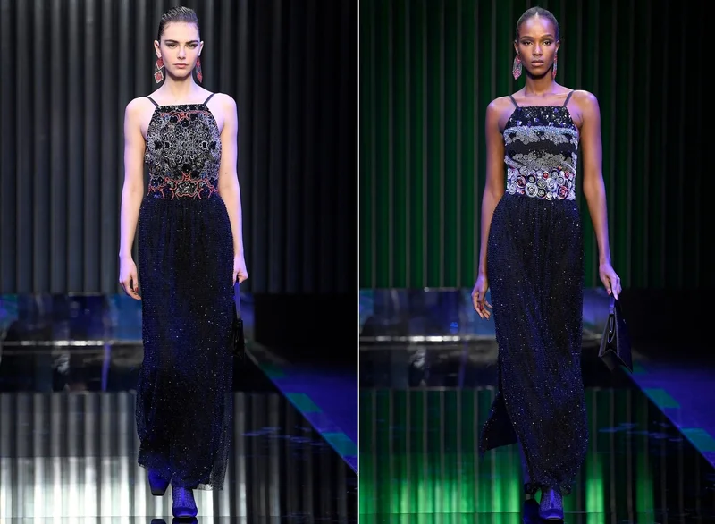 Мягкие и мерцающие брюки, небрежно заправленные в высокие светящиеся ботинки и надетые под платья, пожалуй, стали главной фишкой Армани в новой коллекции. Но звёзды, восседавшие в первом ряду дефиле, фаворитами признали другие модели, в том числе замысловато вышитые бисером облегающие топы.