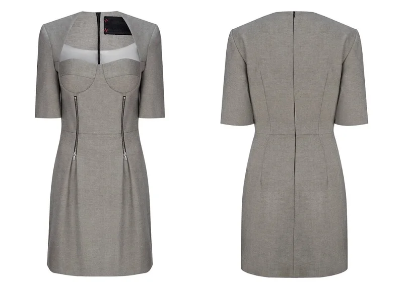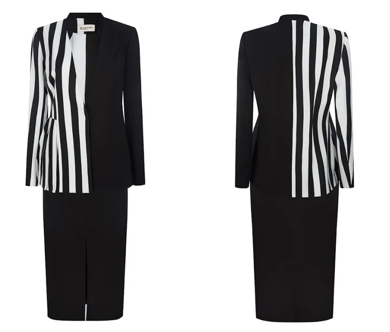 Очень интересна серия двусторонних пиджаков – одна половина у них полосатая (чёрно-белая), другая – чёрная. Подойдёт любительницам поэкспериментировать с деловым дресс-кодом – в образ вносится изрядная доля эксцентричности при сохранении классической основы. Не менее интересно ещё одно платье, но уже по своему фигурному крою. Напоминает трансформер, с двумя молниями на талии, широким вырезом и отрезным лифом. Эту модель, наверняка, оценят уверенные в себе женщины, любящие соблазнительные, подчёркивающие фигуру наряды.