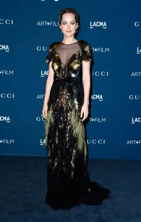 Для британской премьеры «Пятидесяти оттенков серого» (2015) Джонсон надела платье от Yves Saint Laurent на тонких бретелях и с глубоким вырезом, отделанным кристаллами.