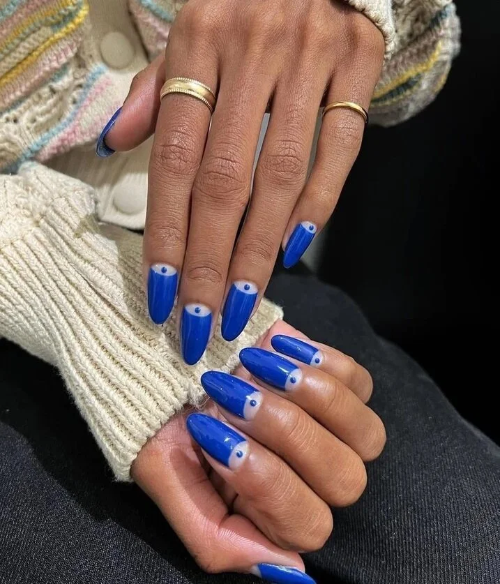 Самый актуальный цвет этой осени, как ни странно, синий. «2022-й – это 50 оттенков синего», - признаёт Квинни Нгуен, которая спроектировала этот дизайн негативного пространства с кобальтовым синим из палитры лаков OPI. Цвет освежает и одновременно успокаивает.