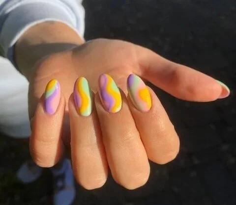 «Вихревой» нейл-арт в этом году очень популярен. Он может быть приглушённым, если использовать землистые тона, или забавным, с яркими оттенками. В зависимости от палитры тренд применим в любое время года.