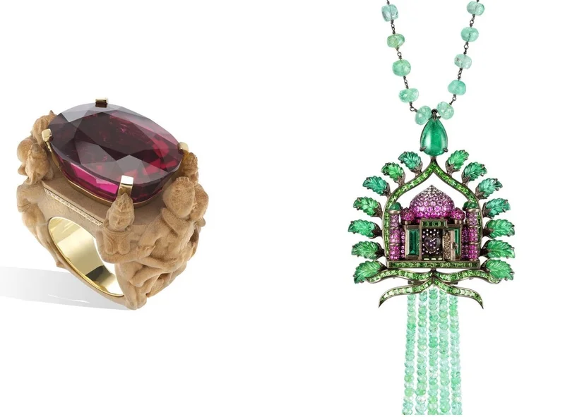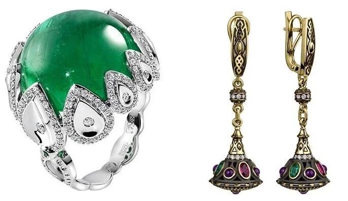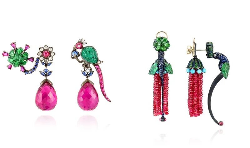 В ассортимент входят семь предметов: два набора серёжек, три кольца и колье. Выполнены они из золота, рубинов, изумрудов, рубеллитов, сапфиров, сандалового дерева. В розово-зелёной гамме. Автор как будто приглашает нас в путешествие по богатым индийским храмам, где проходят многодневные пышные торжества. Мотивы в дизайне используются тоже традиционные: слон, баядерки, знаменитый Тадж-Махал, королевская кобра, лягушки, павлины. Если в один из предстоящих праздников вы захотите себя побаловать необычным украшением, то вам в Lydia Courteille. Как минимум, привлечёте внимание окружающих стильным кольцом или серёжками, максимум, почувствуете себе богиней вечеринки.