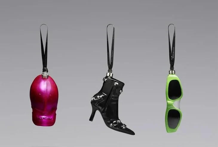 Выполнены игрушки из ударопрочного стекла и расписаны вручную. В качестве «вешалки» служит чёрная сатиновая лента с повторяющимся названием «Balenciaga». Цену можно узнать по запросу на сайте бренда.