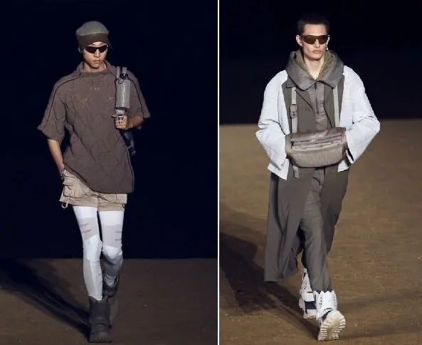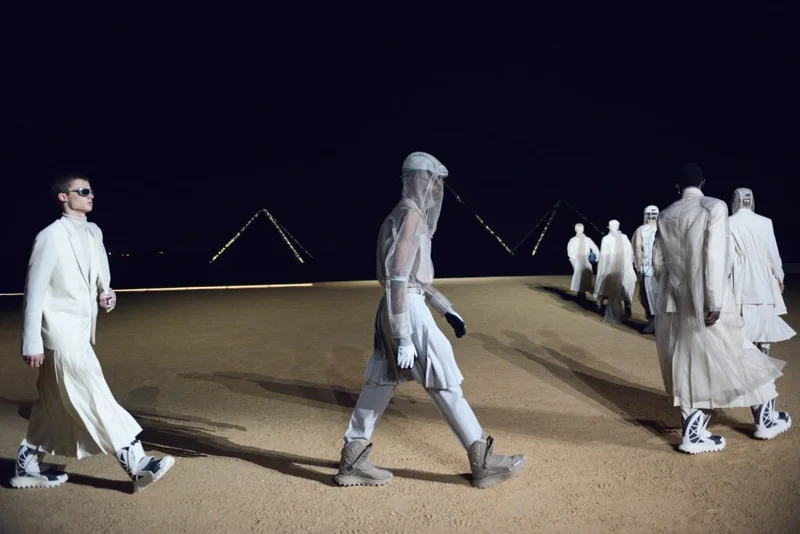 Началось дефиле после заката в непосредственной близости от знаменитых пирамид Гизы – впечатляющее зрелище, установившее новую планку для демонстрации моды в условиях завершившейся пандемии. Манекенщики выглядели эффектно на светящемся подиуме, уходящем за горизонт. Три пирамиды выделялись графичными силуэтами на фоне ночного неба. Показ изобиловал футуристичными моделями в оттенках серого, кремового и бежевого с яркими добавлениями оранжевого и жёлтого.