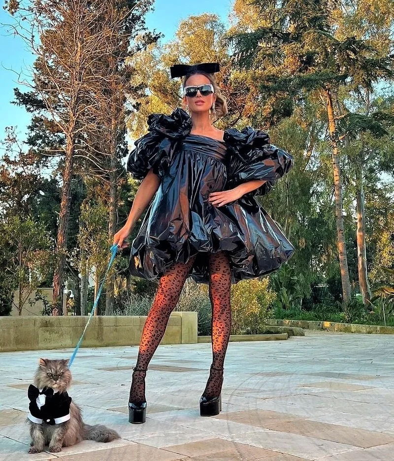 Для дневного «выхода в свет» актриса выбрала платье Vaquera, ставшее мемом в сети из-за явной отсылки к мусорным пакетам. Модель произведена из кожи, имеет блестящую поверхность, свободный силуэт и пышные рукава. Кейт дополнила его туфлями на платформе от Valentino, узорчатыми колготками, высокой причёской с игривым бантиком и объёмными солнцезащитными очками.