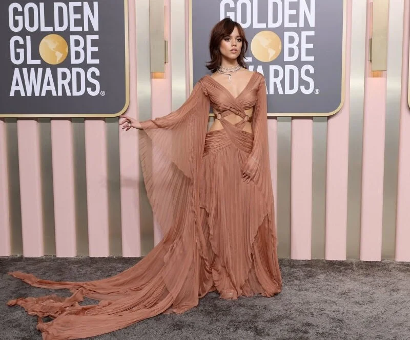 Дженна Ортега развернулась на 180 градусов от своей знаменитой героини Уэнсдэй Аддамс на церемонии вручения «Золотой глобус», состоявшейся 10-го января. Перед фотографами она предстала в полупрозрачном бежевом платье с женственной плиссировкой, фигурными вырезами и широкими рукавами. Нежный образ актриса дополнила причёской-бобом с медными прядями, чёрной подводкой для глаз и серебристыми ожерельями Tiffany.