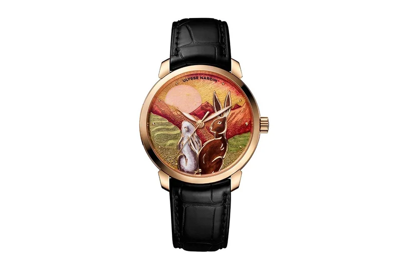 А вот Piaget порадует клиентов 38 экземплярами коллекции Altiplano, дизайн которой разрабатывала эмальер Анита Порше. Циферблат украшает пара кроликов в мягких серых тонах. Ещё один дуэт, сидящий среди холмов, был исполнен Донзе Кадрансом для Ulysse Nardin. Это часы из серии Classico Rabbit, выполненные в технике шамплеве и клуазонне.