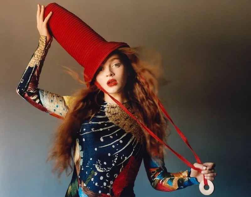 Синк предстала в фантазийном костюме, напоминающем одеяние одной из героинь театра марионеток, комбинезоне от Alexander McQueen и шляпе Esenshel. В беседе с журналом она рассказала о том, как вошла в «большое кино» и каким был для неё первый поцелуй, который случился на съёмках сериала «Очень странные дела».